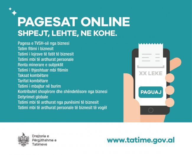 Kujtojmë çdo sipërmarrës apo individ se ka mundësinë të realizojë online pagesat e 13 detyrimeve tatimore, përmes platformës e-Albania, në çdo kohë dhe pa asnjë kosto printimi.