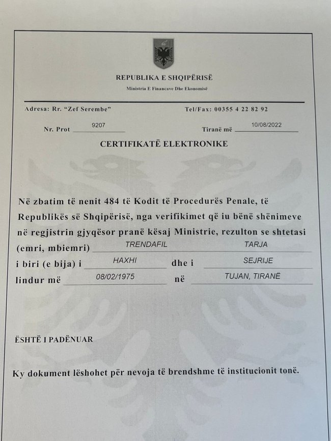 Vendimin e Gjykatës së rrethit Gjyqësor Tiranë, nr. 2788, datë 15.09.2016, ku citohet se është pushuar çështja penale në ngarkim të zotit Tarja, për mungesë provash, duke e shpallur atë të pafajshëm, vendim i lënë në fuqi edhe në vendimin nr. 2120, datë 08.10.2018, të Gjykatës së Apelit Tiranë. Kjo konfirmohet edhe nga dëshmia e penalitetit, ku rezulton i pa dënuar!