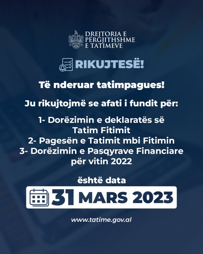 Drejtoria e Përgjithshme e Tatimeve rikujton të gjithë tatimpaguesit se afati i fundit për dorëzimin dhe pagesën e deklaratës së tatim fitimit dhe pasqyrave financiare për vitin fiskal 2022 është data 31 mars 2023.