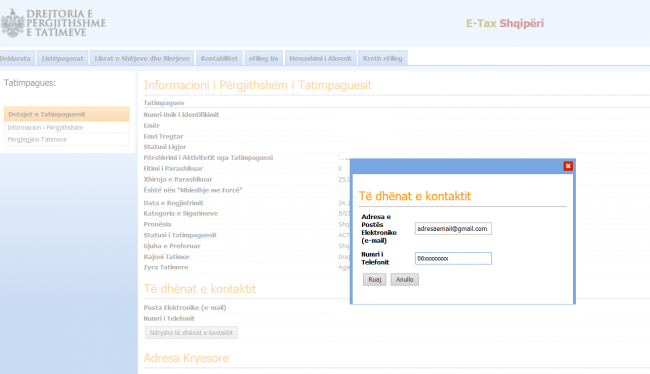 Për të lehtësuar komunikimin me administratën tatimore si dhe nisur nga ndryshimet në tregun e telefonisë së lëvizshme në vend, Drejtoria e Përgjithshme e Tatimeve, ju fton të përditësoni të dhënat tuaja të kontaktit. Përditësimi i tyre kryhet lehtësisht në llogarinë individuale të çdo tatimpaguesi në e-filing. Në rubrikën “efiling im” klikoni në “Profili im” ku do t’ju shfaqet "Informacioni i Përgjithshëm i Tatimpaguesit". Klikoni butonin “Ndrysho të dhënat e kontaktit” dhe pasi të keni vendosur të dhënat e reja klikoni butonin “Ruaj”. Ky është një proces i cili mund të kryhet sa herë që të dhënat tuaja të kontaktit ndryshojnë.