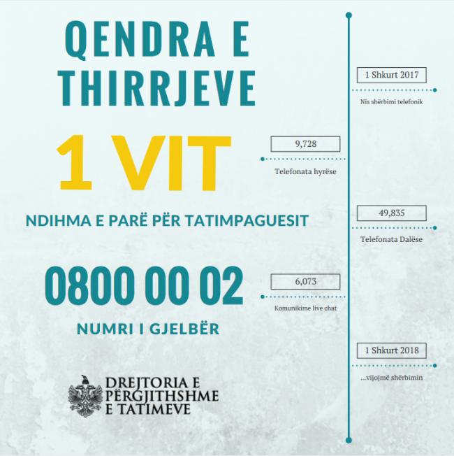 Në një vit nga çelja e Qendrës së Thirrjeve, Drejtoria e Përgjithshme e Tatimeve ofroi shërbim pa pagesë për më shumë se 65.000 tatimpagues. Qendra e Thirrjeve u konceptua si një instrument në dobi të qytetarëve dhe sipërmarrjes duke ju ardhur atyre në ndihmë paravësisht vendndodhjes dhe pa asnjë kosto. Qendra e Thirrjeve shërben si ndihmë e parë për informacion dhe asistencë lidhur me legjislacionin tatimor, deklarimin elektronik apo edhe për shërbime të tjera të ofruara nga administrata tatimore.