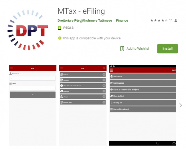 Aplikacioni M-Tax eFiling, operon në sistemet Android, iOS dhe zë shumë pak hapësirë në memorien e pajisjes suaj elektronike. Identifikimi bëhet përmes emrit të përdoruesit (NIPT) dhe Fjalëkalimit.
