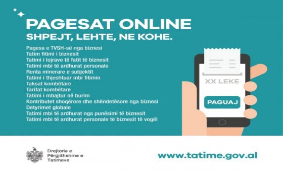 Çdo sipërmarrës apo individ ka mundësinë të realizojë online pagesat e 13 detyrimeve tatimore, përmes platformës e-Albania, në çdo kohë dhe pa asnjë kosto printimi. Ndërkohë lista e shërbimeve tona online është pasuruar tashmë edhe me Çertifikatën e Rezidenzës Tatimore.