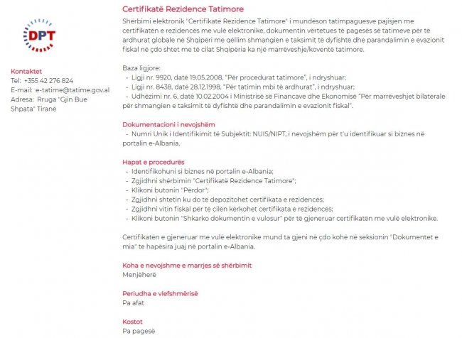 "Çertifikata e Rezidencës Tatimore", ofron dokumentin me vlerë ligjore, i cili vërteton pagesën e tatimeve për të ardhurat globale në Shqipëri, nga ana e subjektit kërkues. Kjo Çertifikatë me vulë dixhitale, njihet nga të gjitha shtetet me të cilat Shqiperia ka Marrëveshje për shmangien e taksimit të dyfishtë dhe parandalimin e Evazionit Fiskal”.