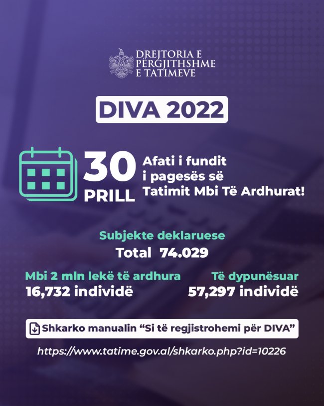 DIVA 2022, 30 prilli afati i fundit i pagesës së tatimit mbi të ardhurat